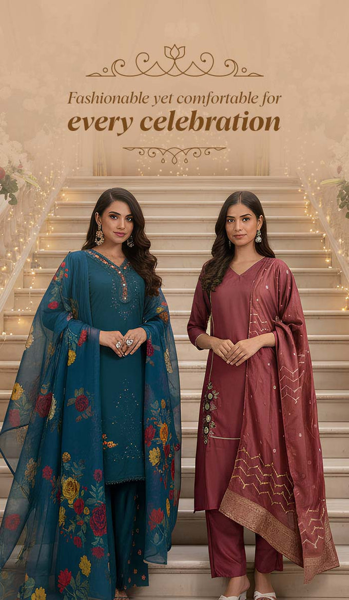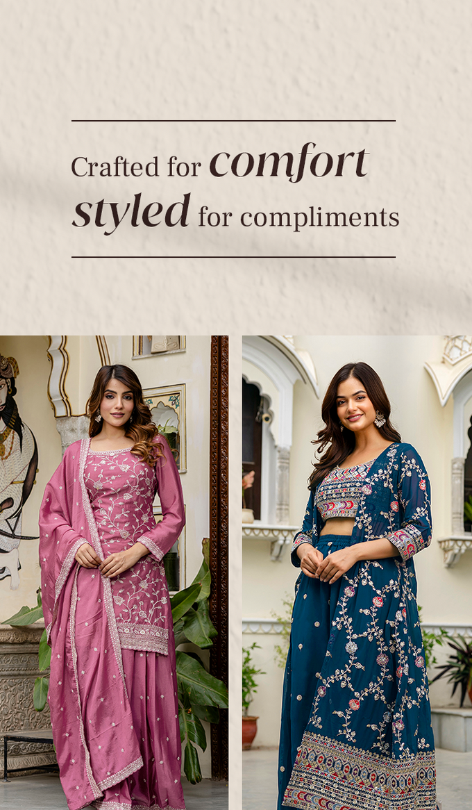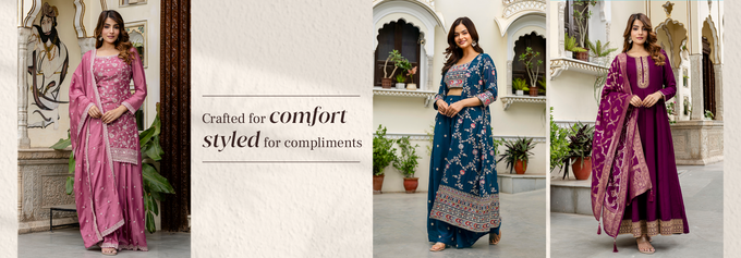 Explore salwar suits, anarkali suits, palazzo sets, and trendy printed sets. Made with breathable materials, these outfits blend tradition with modern style.