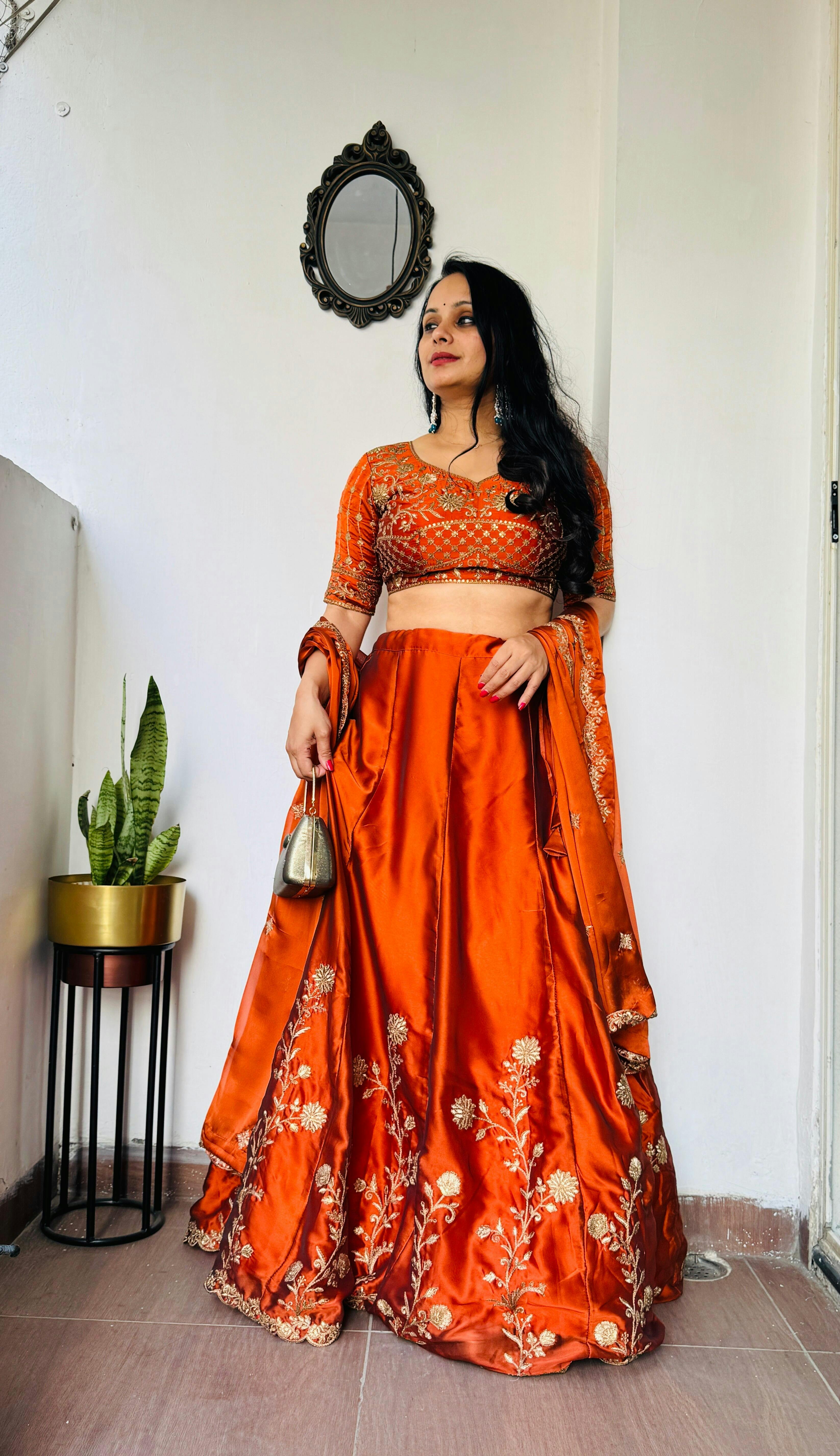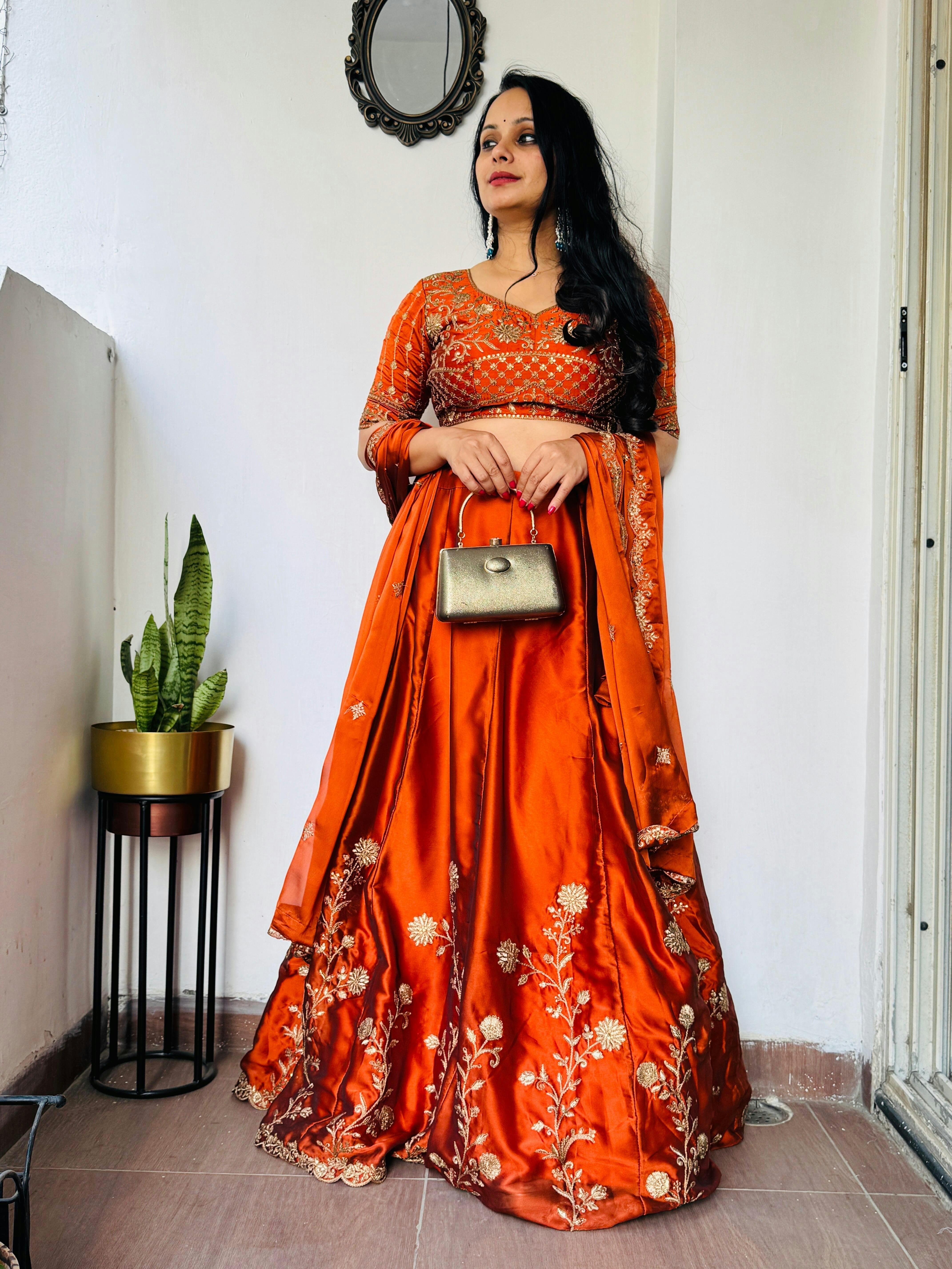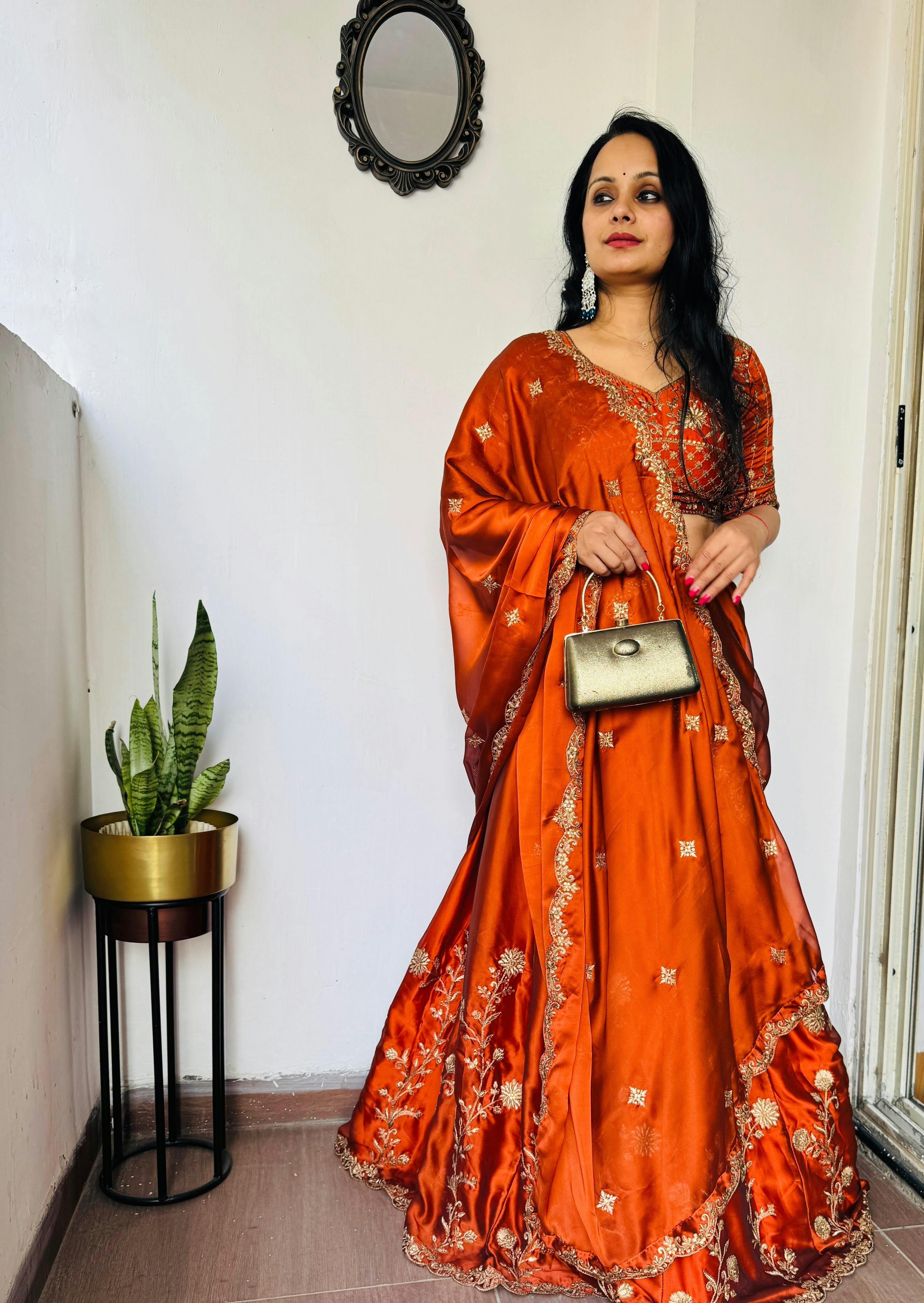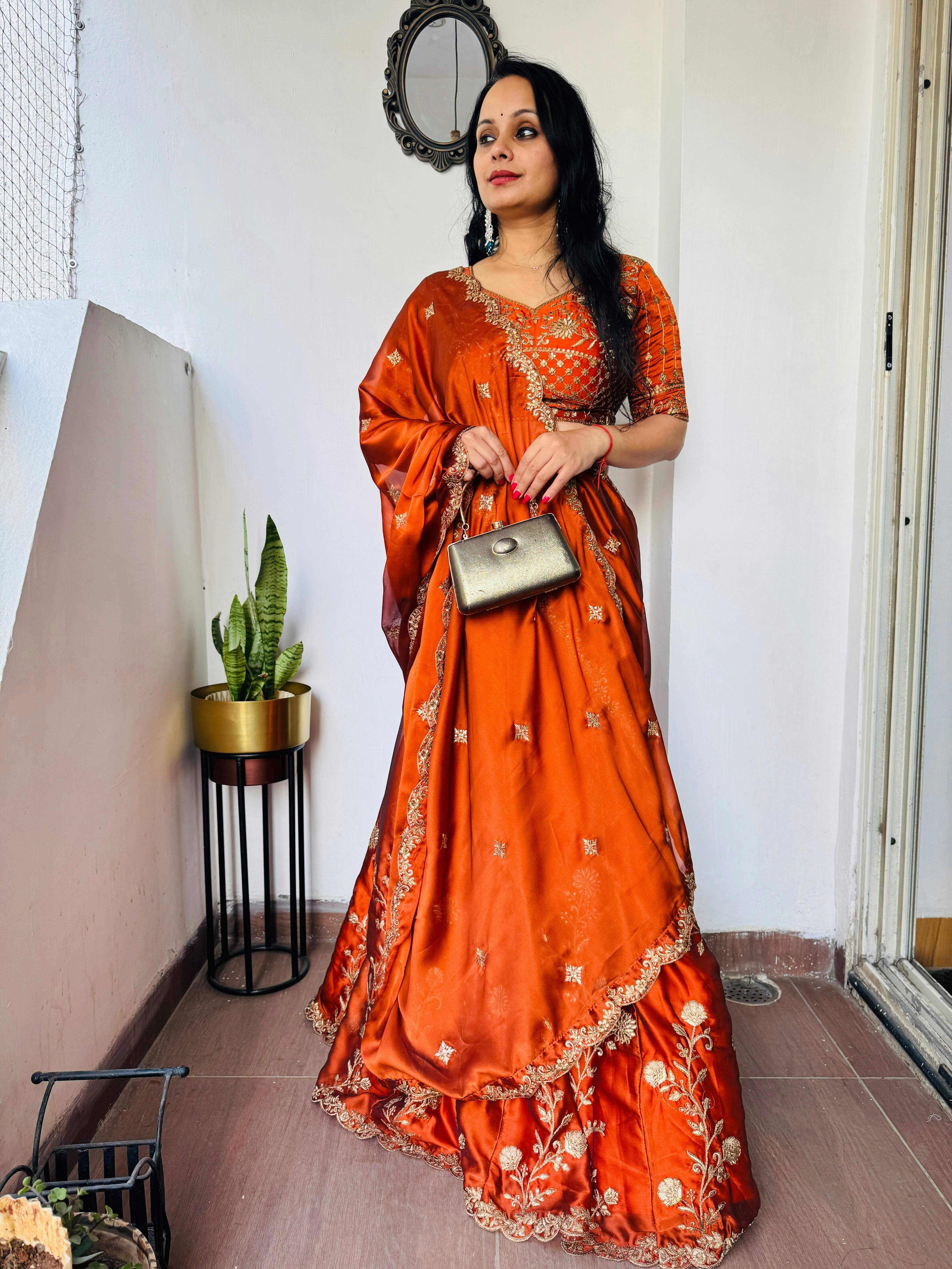 Dark Orange Art Silk Semi Stitched Embroidery Work Lehenga Choli With Dupatta
