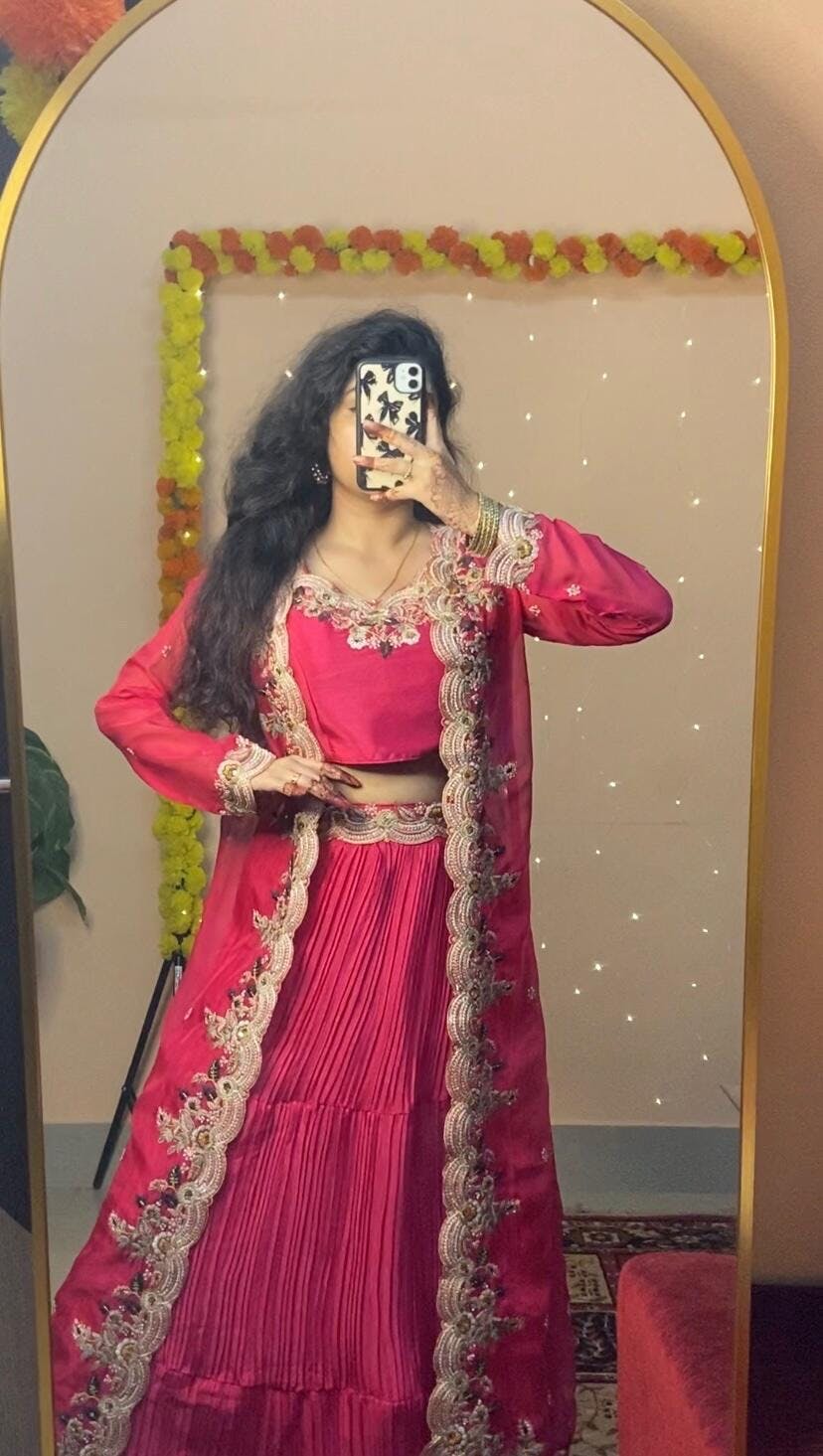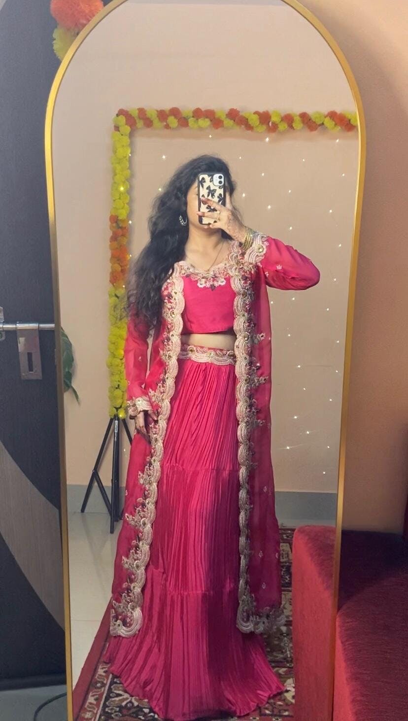 Stitched Type: Ready to Wear Stitched Crop Top with Flared Pleated Skirt and Shrug Set|| Package Contents: 1 Top Skirt Shrug